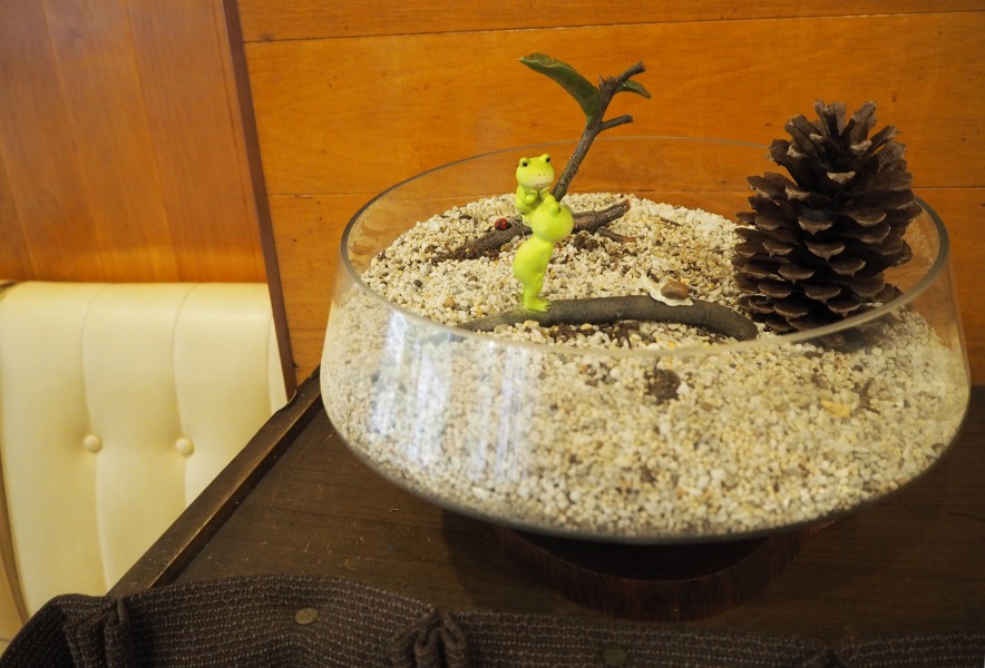 目についた松ぼっくりとカエルの置物について尋ねると、